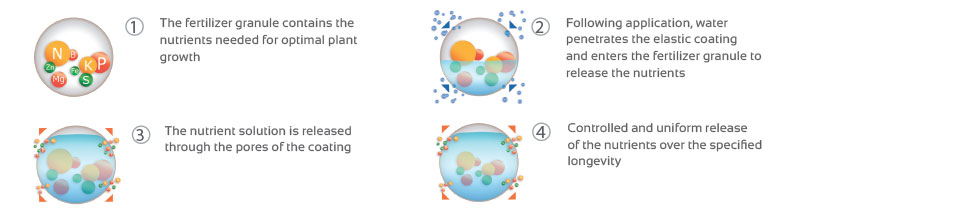 The nutrient release is regulated by a semi-permeable membrane which completely coats the fertilizer granule. The specific thickness of this polymer coating determines the longevity of nutrient release.